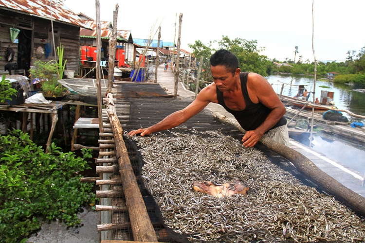 Seorang nelayan sedang menjemur ikan Bilis
